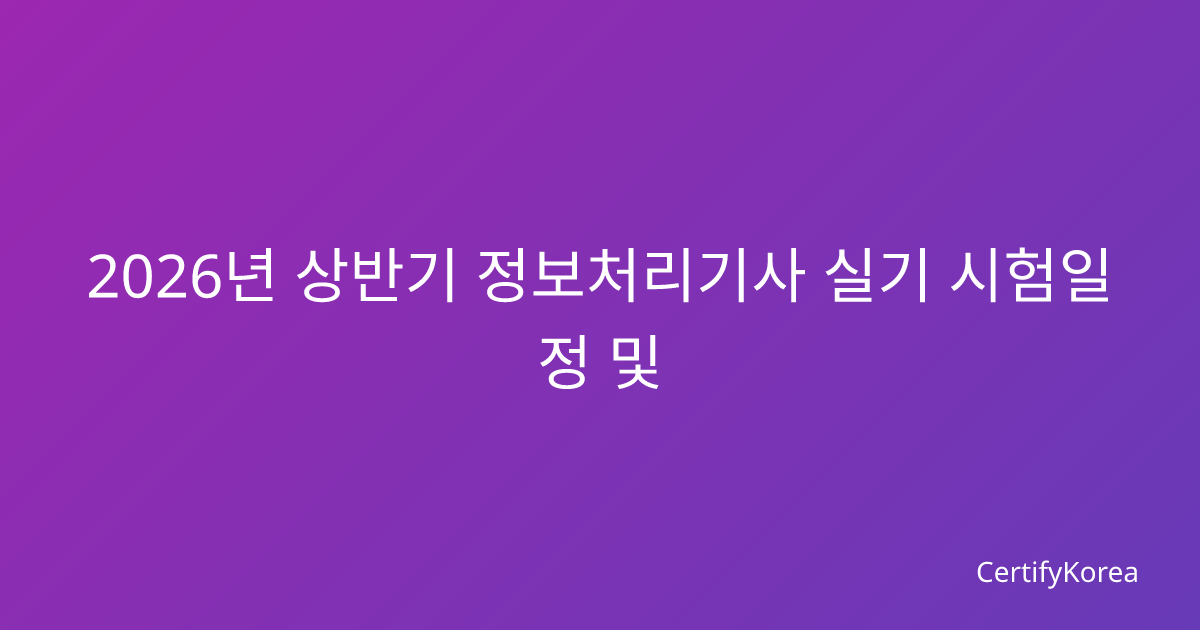 2026년 상반기 정보처리기사 필기 시험 일정 2026년 상반기 정보처리기사 필기 시험은 한국산업인력공단 주관 하에 실시됩니다. 올해 상반기 시험 일정을 정확히 파악하여 체계적인 준비를 시작하는 것이 합격의 첫걸음입니다.제1회 정기검정 – 원서접수: 2026년 1월 21일 ~ 1월 24일 – 필기시험: 2026년 3월 2일(일) – 필기 합격발표: 2026년 3월 21일(금)제2회 정기검정 – 원서접수: 2026년 4월 28일 ~ 5월 … 더 읽기